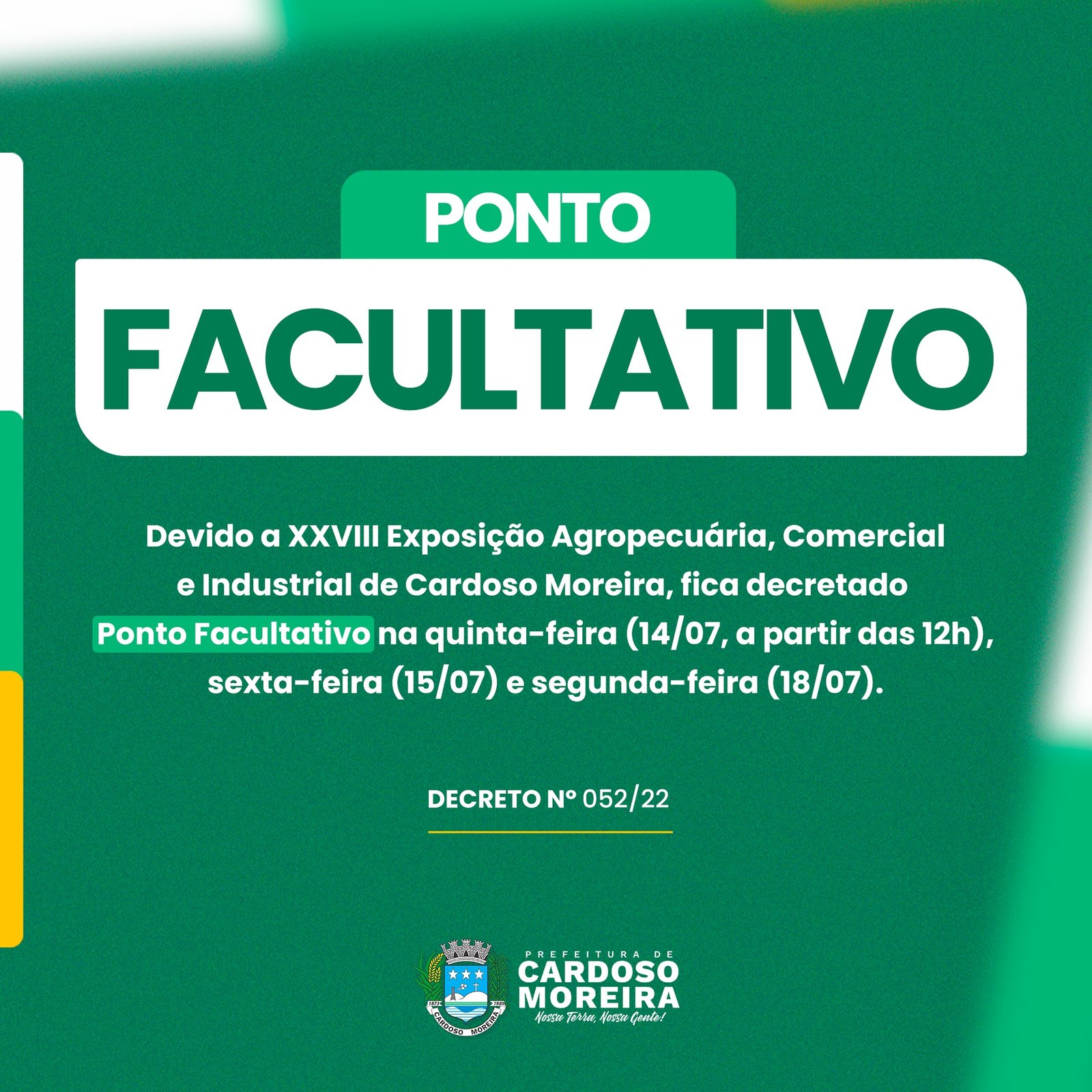 Devido a XVIII Exposição Agropecuária, Comercial e Industrial de Cardoso Moreira, que começa na próxima quinta-feira (14/07), a prefeitura do município decretou ponto facultativo nos dias 14 de julho (quinta-feira), a partir das 12h, 15 de julho (sexta-feira) e 18 de julho (segunda-feira) para as unidades públicas municipais.