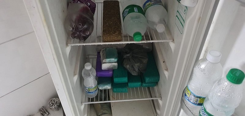 Na residência foram apreendidos 67 sacolés de cocaína, quatro tabletes de pasta base de cocaína, 13 tabletes de maconha, três potes e uma sacola contendo cocaína, oito comprimidos de ecstasy, 1087 pinos de cocaína, 365 porções de maconha, duas placas de veículo, mochila, dois pratos plásticos, duas peneiras, sacolés vazios, três embalagens de munição de calibre 40 da marca CBC vazias, forma de alumínio, pote plástico, três balanças de precisão, dois rolos de filme de PVC, rolo de fita adesiva, R$ 1.400 em dinheiro, três carregadores de pistola, pistola sem numeração e sem marca de calibre 9mm, 19 munições intactas de calibre 9mm, sete munições de calibre 38 intactas, 11 estojos de munição de calibre 38, estojo de munição de calibre 40, cartucho de calibre 12 intacto, três relógios, quatro cadernos com anotações do tráfico de drogas. Os materiais foram encaminhados à perícia e o resultado 5kg454g de cocaína, 7kg865g de maconha. Os agentes verificaram que o carro apreendido foi roubado no dia 26 de janeiro deste ano e a placa havia sido trocada.