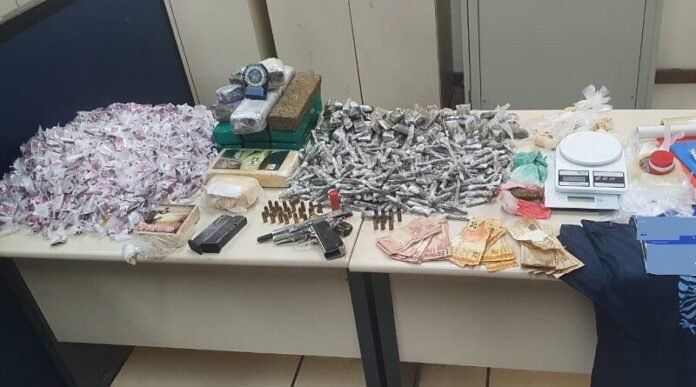 Na residência foram apreendidos 67 sacolés de cocaína, quatro tabletes de pasta base de cocaína, 13 tabletes de maconha, três potes e uma sacola contendo cocaína, oito comprimidos de ecstasy, 1087 pinos de cocaína, 365 porções de maconha, duas placas de veículo, mochila, dois pratos plásticos, duas peneiras, sacolés vazios, três embalagens de munição de calibre 40 da marca CBC vazias, forma de alumínio, pote plástico, três balanças de precisão, dois rolos de filme de PVC, rolo de fita adesiva, R$ 1.400 em dinheiro, três carregadores de pistola, pistola sem numeração e sem marca de calibre 9mm, 19 munições intactas de calibre 9mm, sete munições de calibre 38 intactas, 11 estojos de munição de calibre 38, estojo de munição de calibre 40, cartucho de calibre 12 intacto, três relógios, quatro cadernos com anotações do tráfico de drogas. Os materiais foram encaminhados à perícia e o resultado 5kg454g de cocaína, 7kg865g de maconha. Os agentes verificaram que o carro apreendido foi roubado no dia 26 de janeiro deste ano e a placa havia sido trocada.