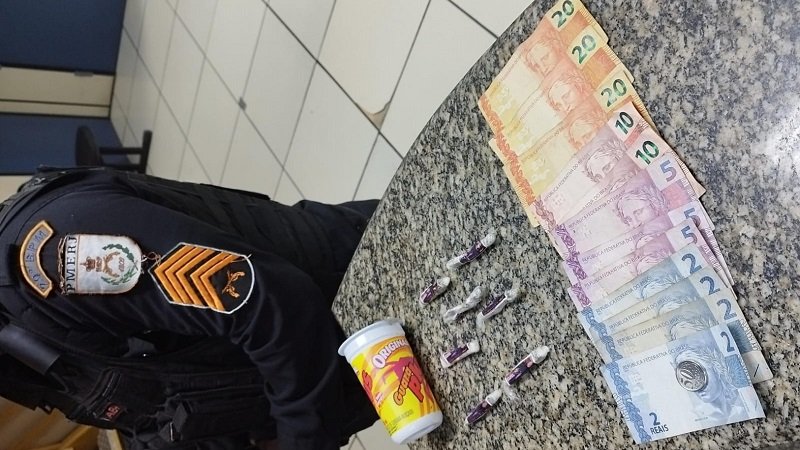 O suspeito foi visto pegando algo no matagal. Em seguida, feita abordagem apreendido um copo plástico contendo sete buchas de maconha. Já no bolso da bermuda do adolescente de 16 anos, havia R$ 103,50.