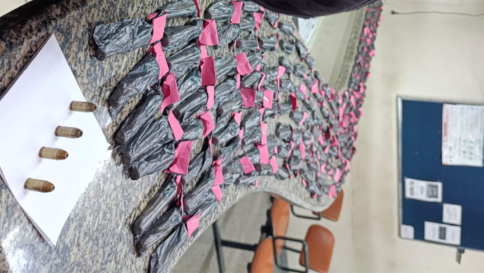 A porta do imóvel estava destrancada e os agentes iniciaram buscas. Foram encontradas sacolas plásticas contendo 211 pinos de cocaína, quatro munições de calibre 380, além de várias caixas de papelão contendo sacos plásticos e fitas que seriam utilizadas para endolar entorpecentes. Não havia ninguém na residência durante ação policial.